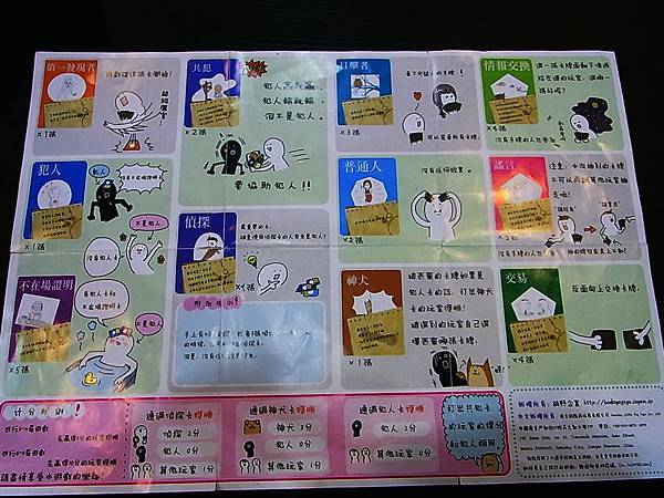 Ex:五人遊戲先選出 第一發現者 犯人 偵探 不在場證明*2 共犯 再抽出14張卡片混洗