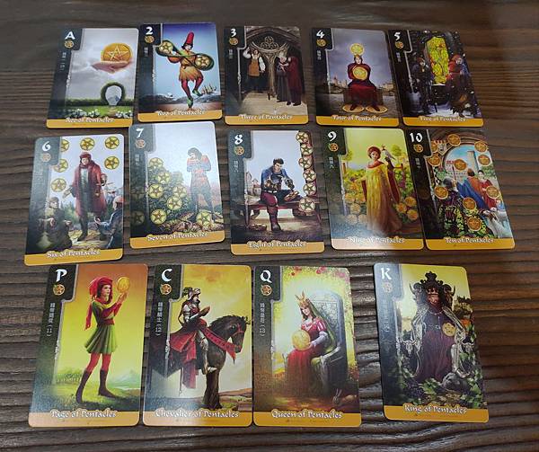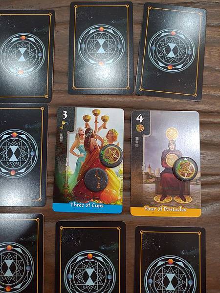發問玩家會得到四種標記物「聖杯2、聖杯1、錢幣2、錢幣1」